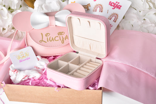 Rausvas rankinukas mergaitei su raudonu kaspinu