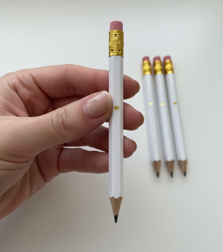 Ieškote nedidelės, bet estetiškos smulkmenos savo šventės svečiams? Šis baltas pieštukas su auksine širdele yra idealus pasirinkimas, kai norisi suderinti paprastumą ir šventinį stilių.