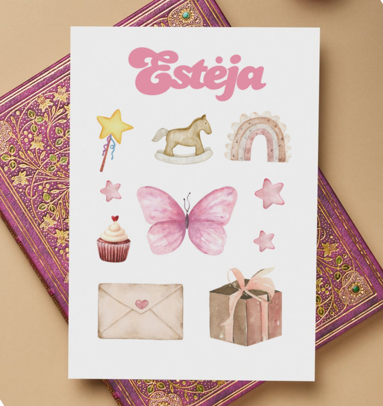 Pasirinkus variantą Rankinukas + lipdukai - gausite 2 a5 dydžio lapus su mergaitės vardu ir kitais paveikslėliais (nurodyta nuotraukoje).