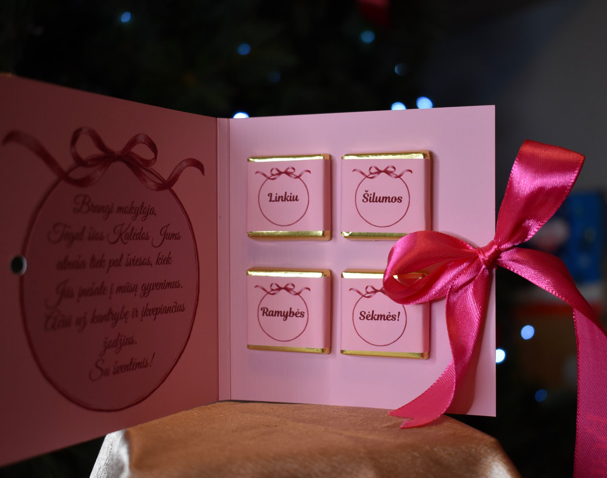 Atvirutės viduje rasite trumpą palinkėjimą ir 4 šokoladukus su palinkėjimu šilumos, ramybės ir sėkmės.