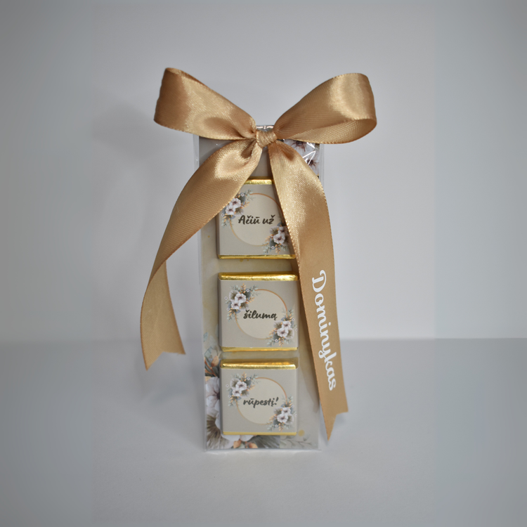 Šokolado plytelės dydis – 3.5 x 3.5cm., sveria 5g.