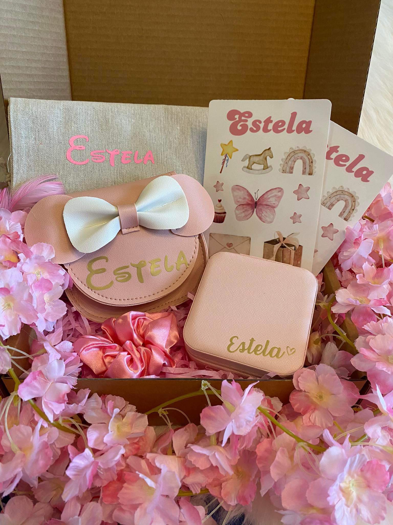 Pasirinkus variantą Pilnas rinkinukas - prie esamo rankinuko gausite papuošalų dėžutę (žemiau nurodysime galimus variantus), lininį maišelį su vardu, 2 a5 dydžio lapus su mergaitės vardu ir kitais paveikslėliais, plaukų gumelė. Nepamirškite paminėti komentaruose norimos papuošalų dėžutės. Galimos papuošalų dėžutės yra: